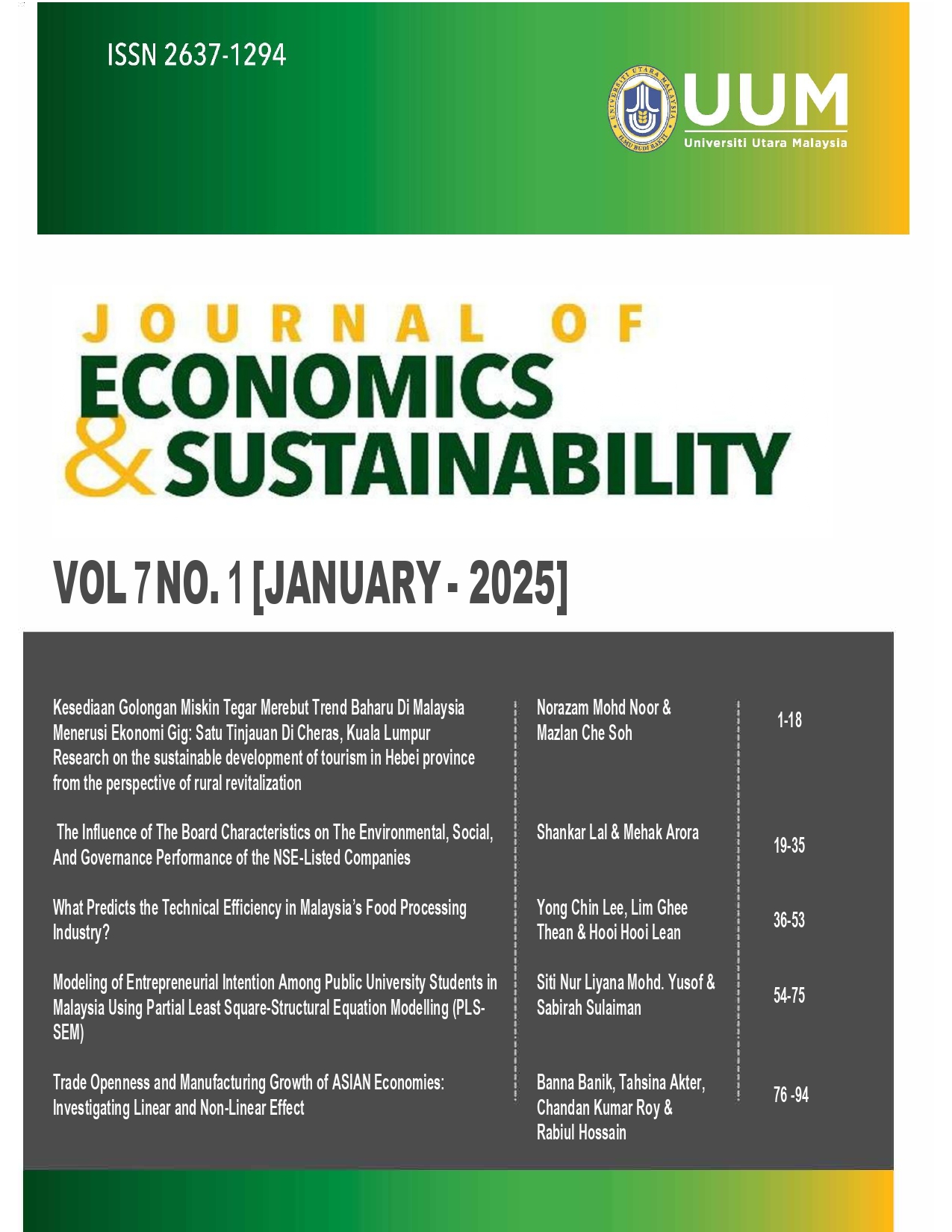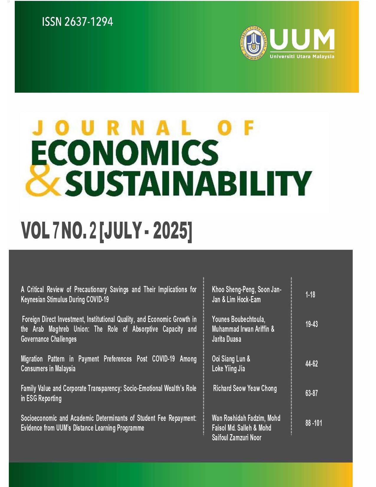 The journal has recently published FIVE (5) papers for Vol. 8, Issue 1, 2026. They could be relevant to your current research and support your writing.We hope you find valuable studies in JES and look forward to receiving your manuscripts for the upcoming issues. If you have any questions or require support with your submission, please do not hesitate to contact our managing editor team at sjmohd@uum.edu.my or shamzaeffa@uum.edu.my.